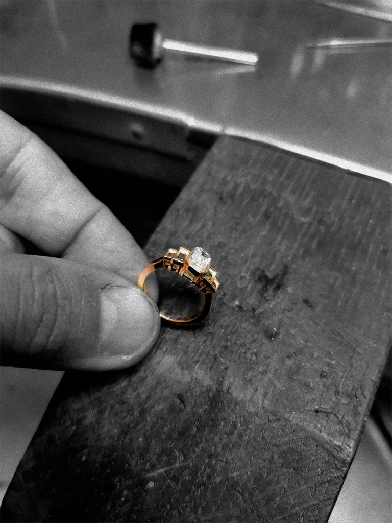 George wanted to create a ring that captured Alice’s unique taste while balancing a bold presence with classic elegance — a piece that felt timeless, yet unmistakably hers.