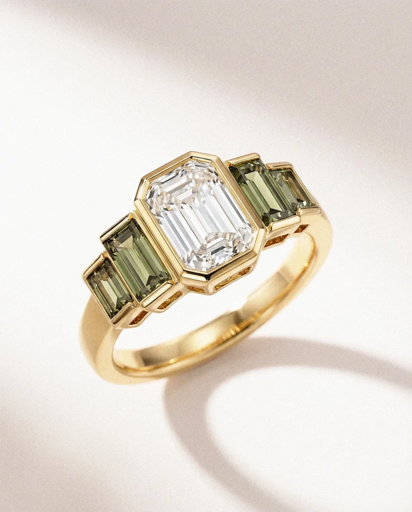 A yellow-gold shank holds a 1-carat baguette step-cut diamond in a smooth bezel, framed by four green baguette sapphires. Their balanced symmetry adds a soft touch of colour and a sense of calm precision. Classic elegance shaped with an Art Deco spirit.