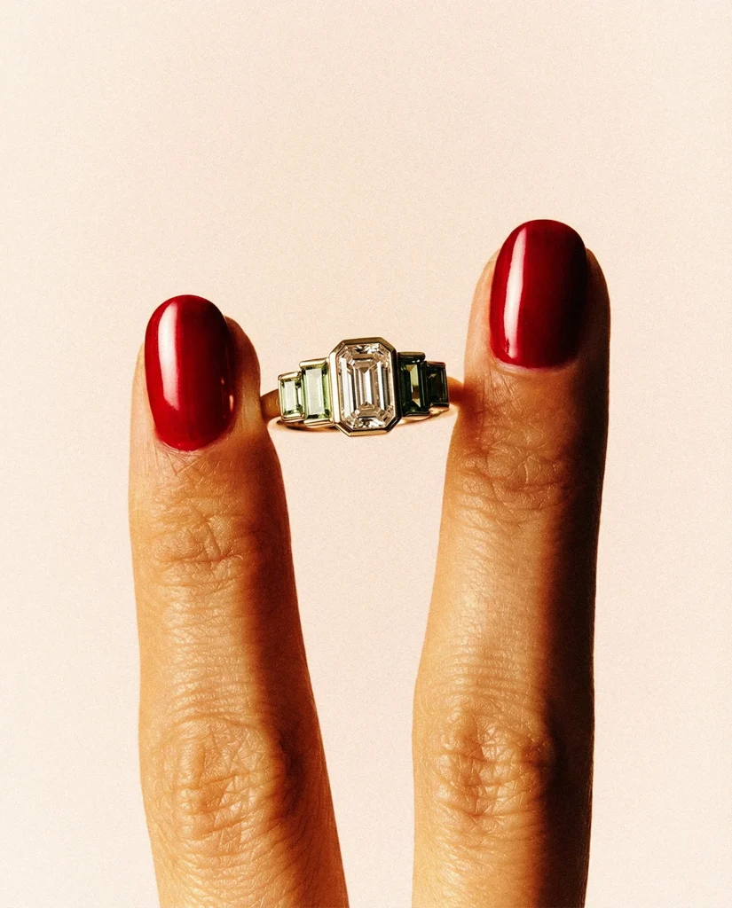 We turned to the Art Deco language for structure and strength, using yellow gold, clean baguette cuts, and touches of colour to achieve that balance. Green sapphires were the perfect choice: soft enough not to overpower the diamond, gently brightening the composition, and beautifully complementing Alice’s skin tone.