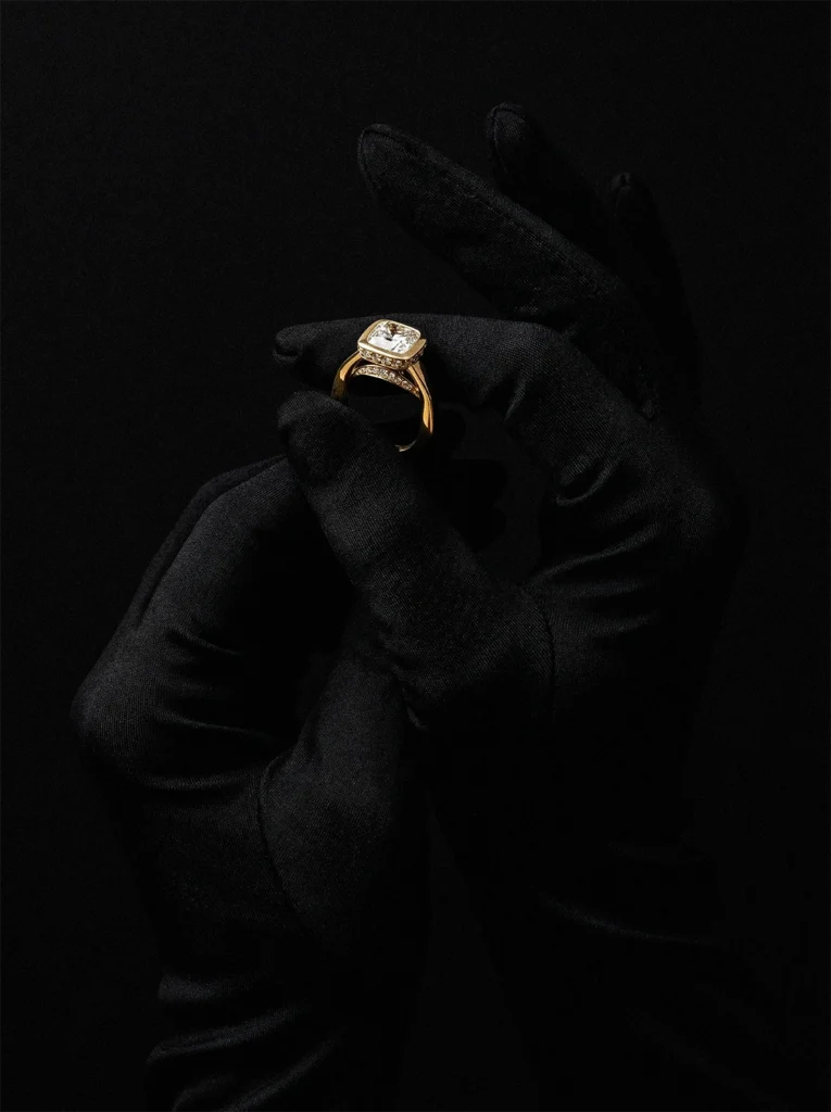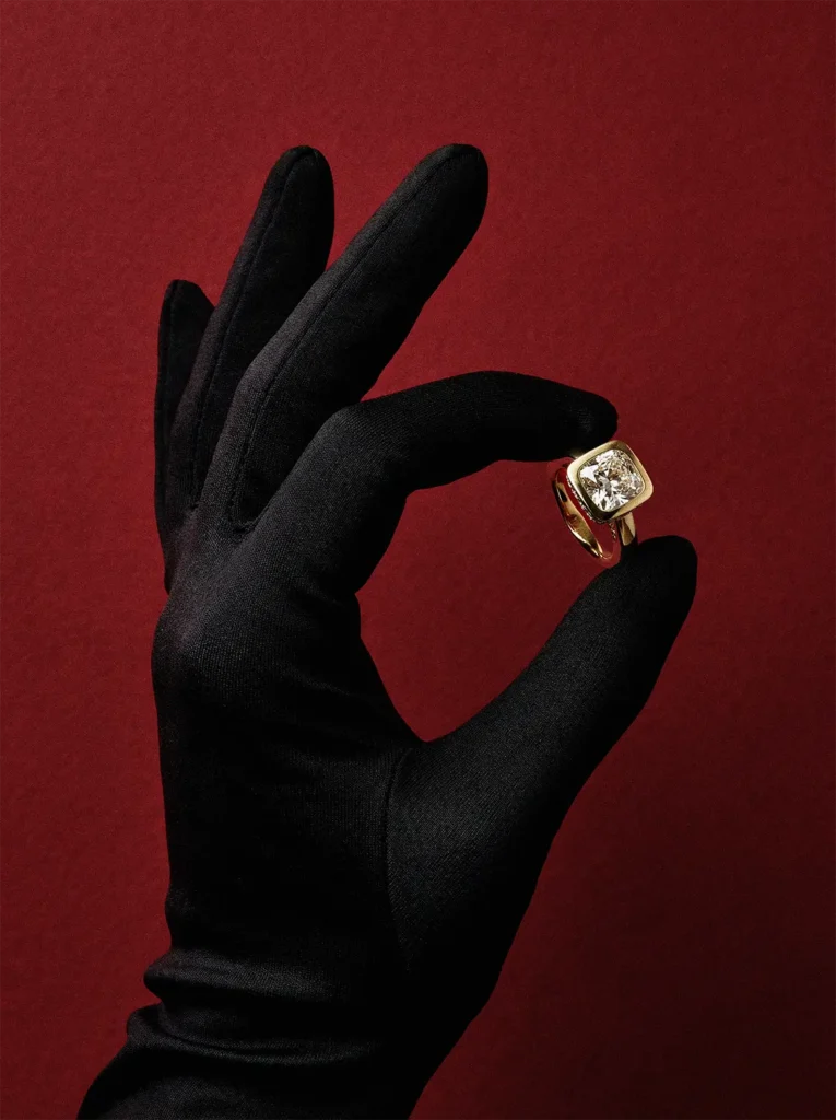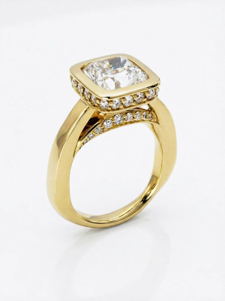 In yellow gold, a cathedral shank frames a cushionmodified diamond with crushed-ice brilliance, supported by a hidden halo and pavé bridge. The twisting lines of the shank and diamonds create a subtle sense of movement. A ruby and a garnet tucked beneath the centre stone add a private, personal touch.